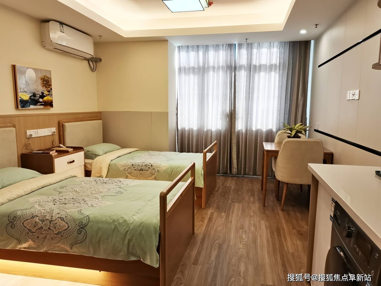 974张床位均按国家级适老化标准结合滨海风格打造,融入42项适老化细节设计,每一处都彰显人文关怀。各房型特色鲜明:双人间为普惠主力房型,面积60-75㎡,人均4398-5800元/月,采用分床设计,配备防滑系数R12级PVC地板、圆角家具、紧急呼叫按钮及独立卫浴,兼顾隐私与安全;单人间面积35-45㎡,月费5800-8200元,配备独立卫浴、智能护理床及全景落地窗,采光极佳,适配注重隐私的长者;精品套房面积80-100㎡,月费8200-11520元,含独立客厅、专属护理服务及全景阳台,适合注重居住品质的家庭;认知症照护专区月费8000-11520元,采用怀旧疗法设计,配备声光引导系统与防走失定位手环,全方位守护特殊长者。
